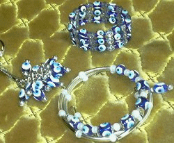 Nazar Bonjur(ナザールボンジュー)のアクセサリー。 この目玉は、ギリシャ神話に出てくる、怖〜いメデューサの目。 魔よけの効果があるそうです。 トルコの女性が、これを身に付けているのをよく見かけましたね。 トルコのお家にお邪魔した時も、必ずどこかにこの目玉は吊るしてあったし、お店やタクシーの中にもたくさんあったわ。